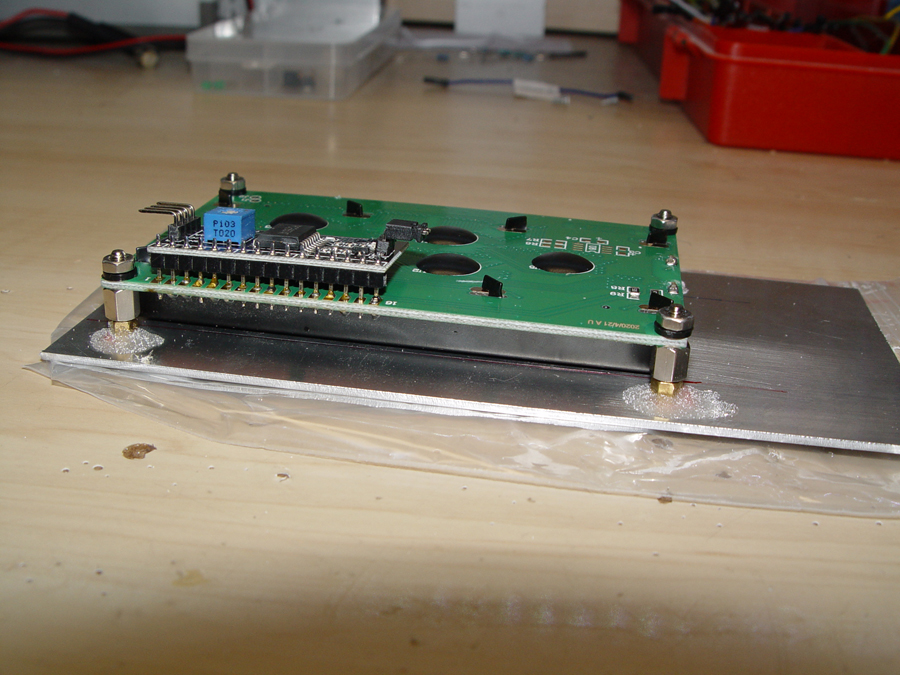 Ich habe jetzt mal ein Display mit Heißkleber fixiert, dann diese Stehbolzen mit Sekundekleber so angeklebt, dass sie auf die Löcher zum Anschrauben passen. Dann nochmal Sekundenkleber, rund um die Stehbolzen und das zugehörige Grunlat drauf gestreut. Das härtet sofort aus. Aber trotzdem muss man alles noch ein paar Std. ohne Belastung aushärten lassen. Ob diese Stehbolzen dann fest sind, wird sich zeigen